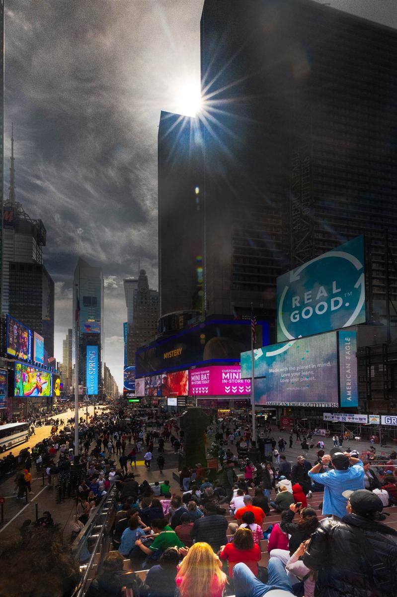 Times Square New York City on April 8, 2024 as the sun was about to go into a solar eclipse. Was very cool in that all of New York City took a break to view what the cosmos had planned for us humans so we would chill.