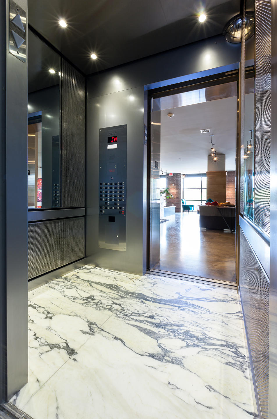Interior architectural photograph at Cast Iron Lofts in Jersey City New Jersey. City Homes and Gardens, Manhattan Building Company. Luxury rental apartments with numerous amenities. Swimming pool,gym,library,laundry in the apartments, high ceilings, wood floors, Viking appliances in the kitchen